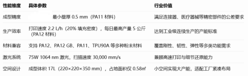 极简投入:设备占地仅0.58平方米,采用标准化电源与气源接口,无需复杂的基建改造,可像工业级FDM设备一样快速部署于现有车间或实验室。